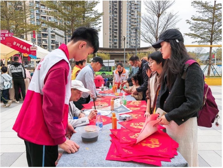 活动当天,现场人头攒动、热闹非凡,伴随着主持人响亮的开场,首届麒妙邻里节正式开市。活动链接镇党群服务中心、镇总工会、镇街坊之家等相关职能部门及15家“共生合伙人”的力量,将一系列暖心服务送到群众“家门口”,让群众尽享新春暖意。40余名“返乡”志愿者齐聚现场,让充满青春活力的“志愿红”成为集市现场一道温暖亮丽的风景线。非遗区内,麒麟舞的艺术魅力、拓印红包的墨香古意、剪纸的新春年味……各种非遗技艺在此集结,传统的技艺在大家的亲手体验中变得鲜活可感;便民服务区同样热闹非凡,家电维修、义诊服务、免费缝补等便民服务同步开展,贴心的举措赢得了群众的一致好评;作为集市最具人气的打卡点之一,来自镇书画协会的志愿者在“骏马送福来”摊位前现场挥毫,将一副副春联送到群众手中,充满了新春的仪式感;“共生义卖区”和暖“新”驿站成为此次活动最温暖人心的亮点,大家在摊位前选购义卖商品,志愿者为外卖骑手送上一份份冬日专属的“温暖包”,用实际行动传递爱心与善意。现场还特别设置了“福满全家”打卡留影区,安排摄影师免费为群众拍全家福,让群众在活动中定格温馨瞬间,留存新春赶集的美好记忆。